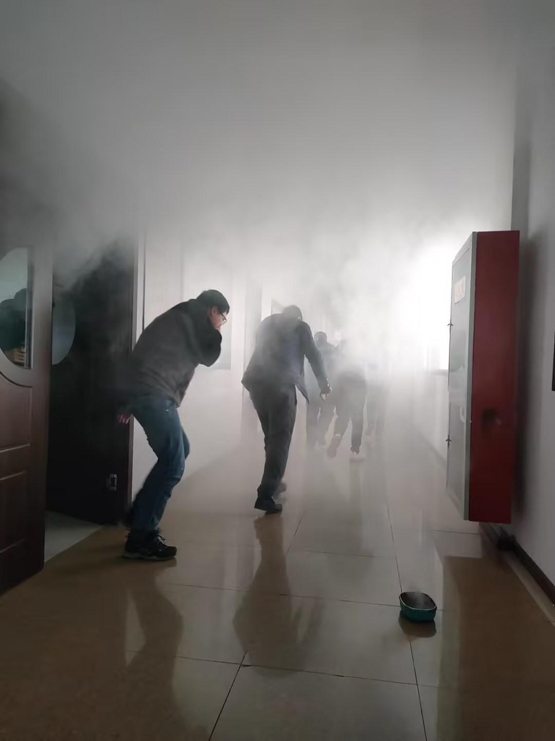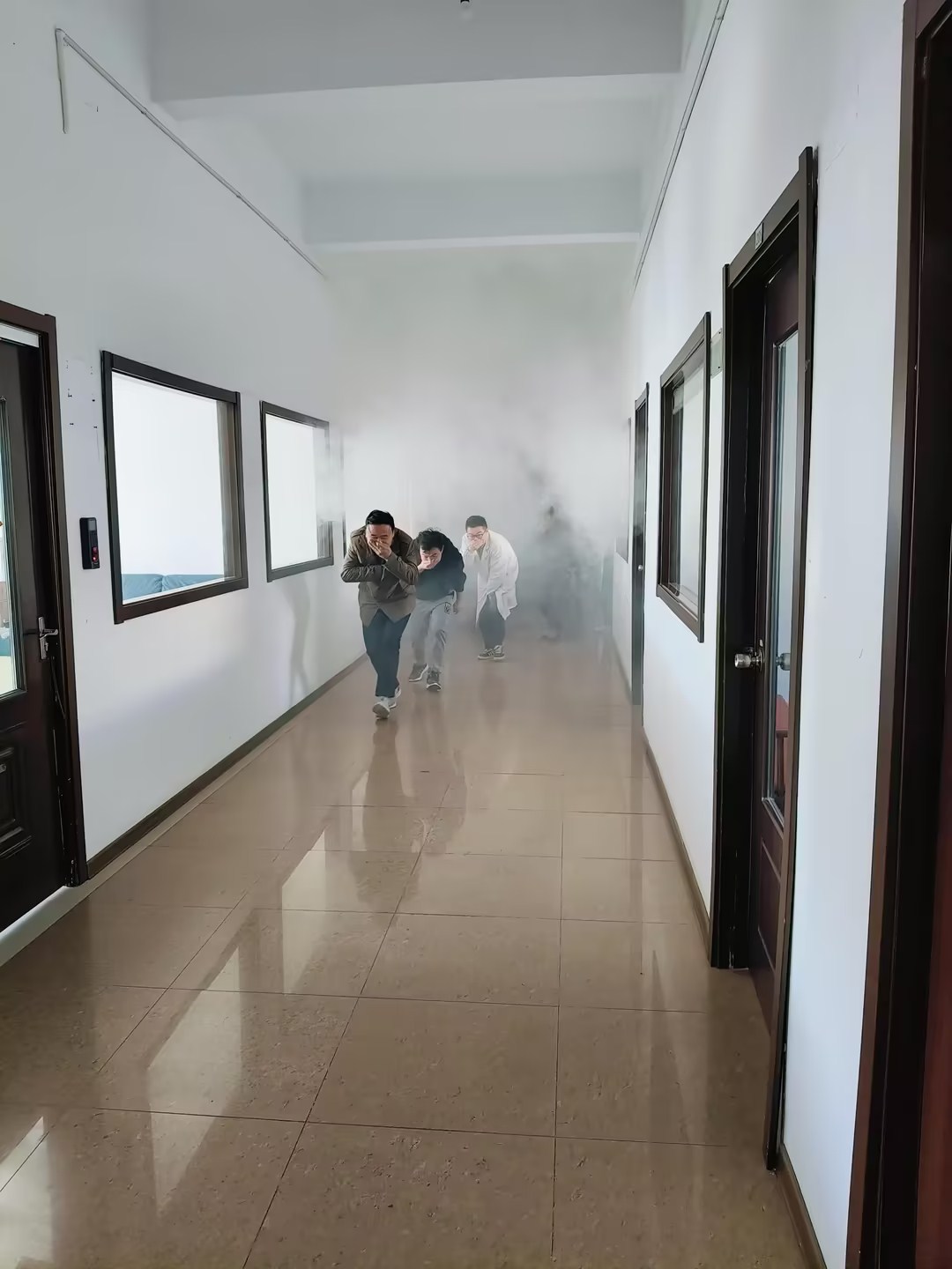 三、進行消防演習 1、逃生 模擬辦公區域著火,辦公室人員遇火災如何快速逃生。